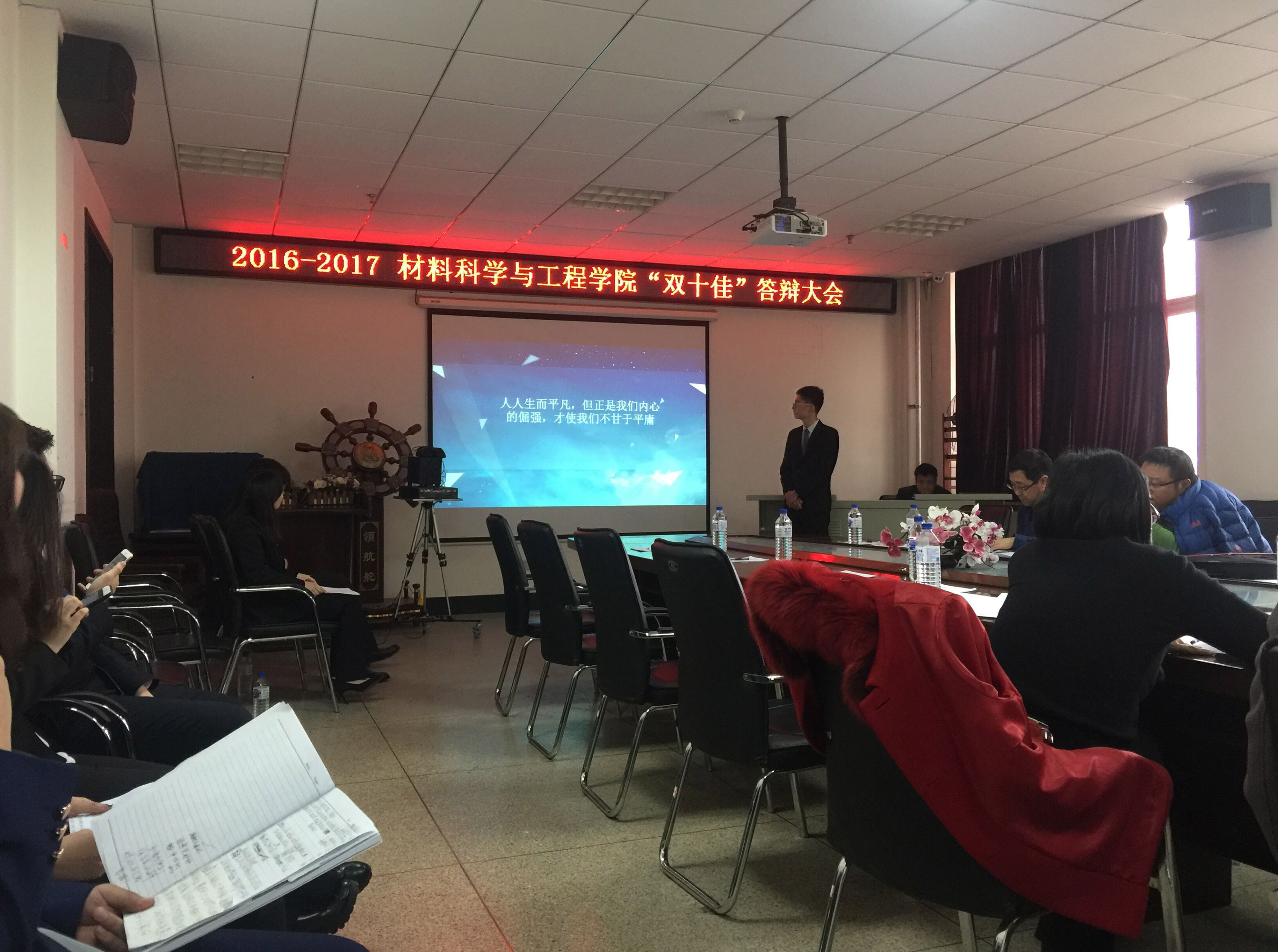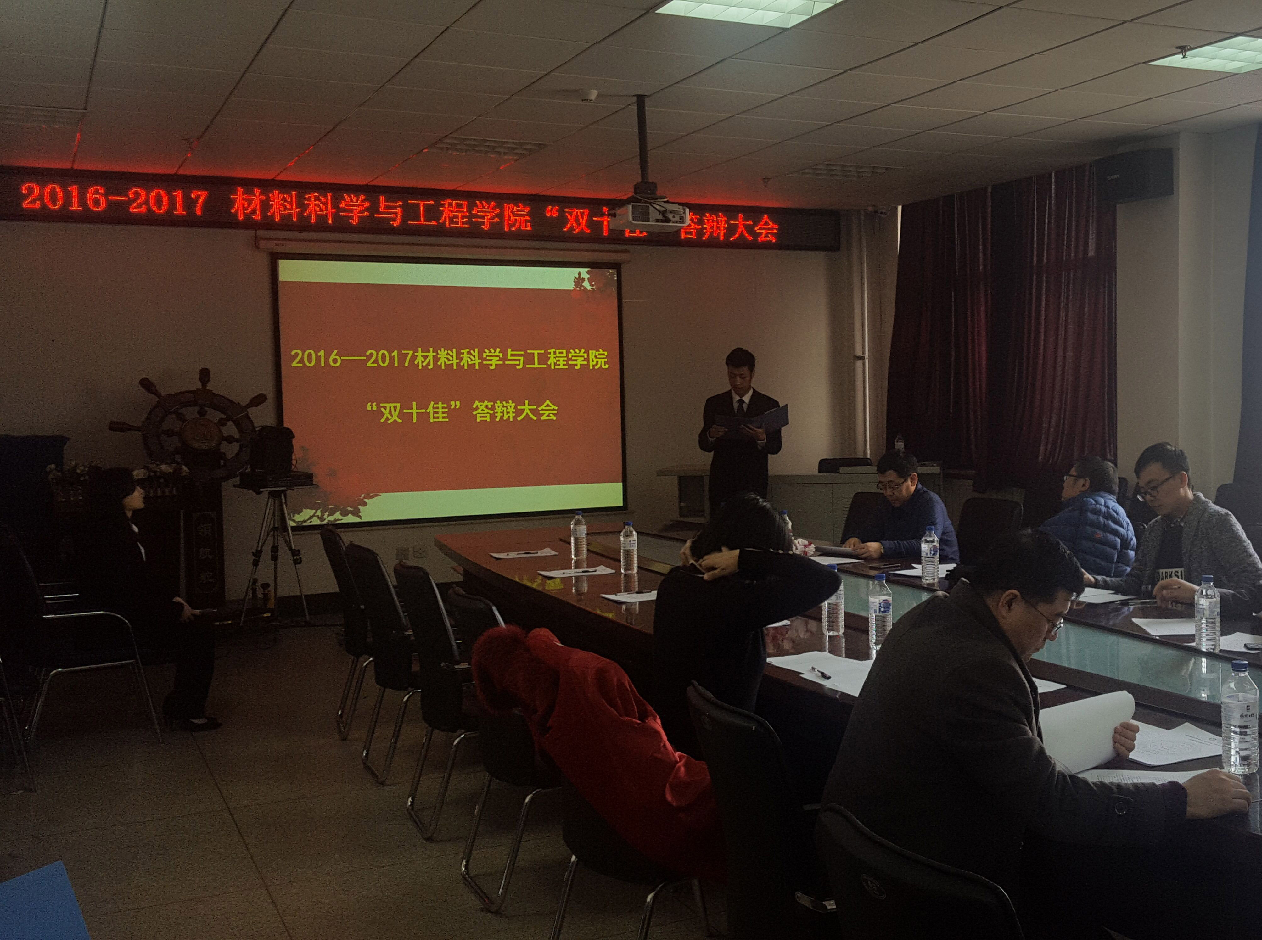 “十佳班级、十佳大学生、材料之星、优秀学生党员”评选答辩大会。材料学院的张培萍老师、金波老师、韩双老师、田宏伟老师、王金国老师、学生工作办公室主任张本龙、2014级辅导员常玥及2015级辅导员佟昊天出席本次答辩大会。