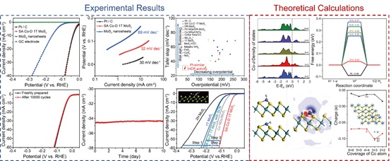 SA Co-D 1T MoS2在酸性电解液中具有类Pt的HER活性,过电位仅为42 mV,Tafel斜率低至32 mVdec-1,且具有优异的电化学循环稳定性。其超高的活性源于单Co原子位点与在畸变MoS2的1T相的S位点,其间的协同作用使得SA Co-D 1T MoS2催化剂具有优异的HER活性。