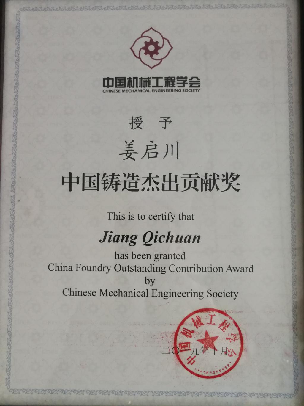 姜启川教授喜获第九届中国机械工程学会中国铸造杰出贡献奖