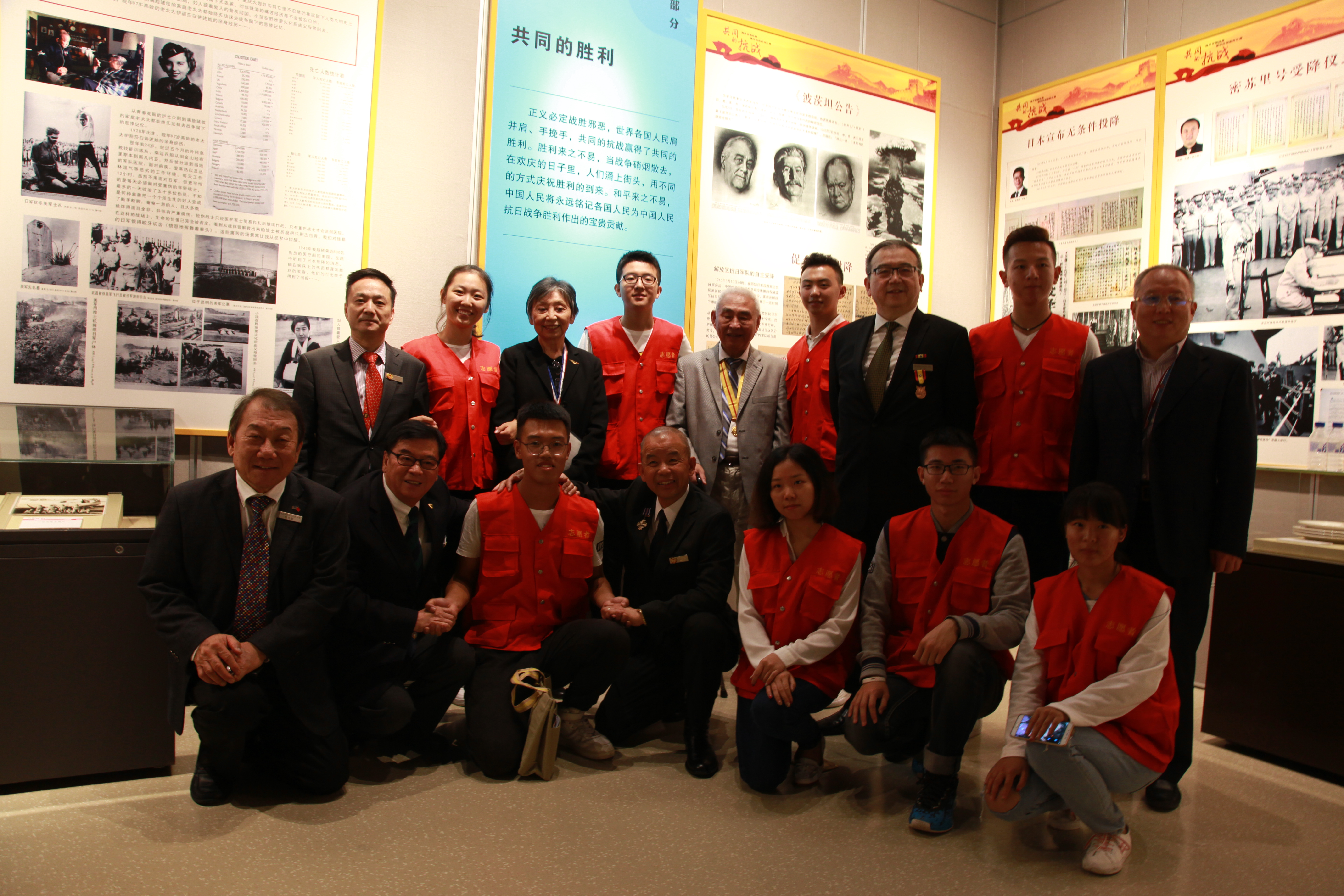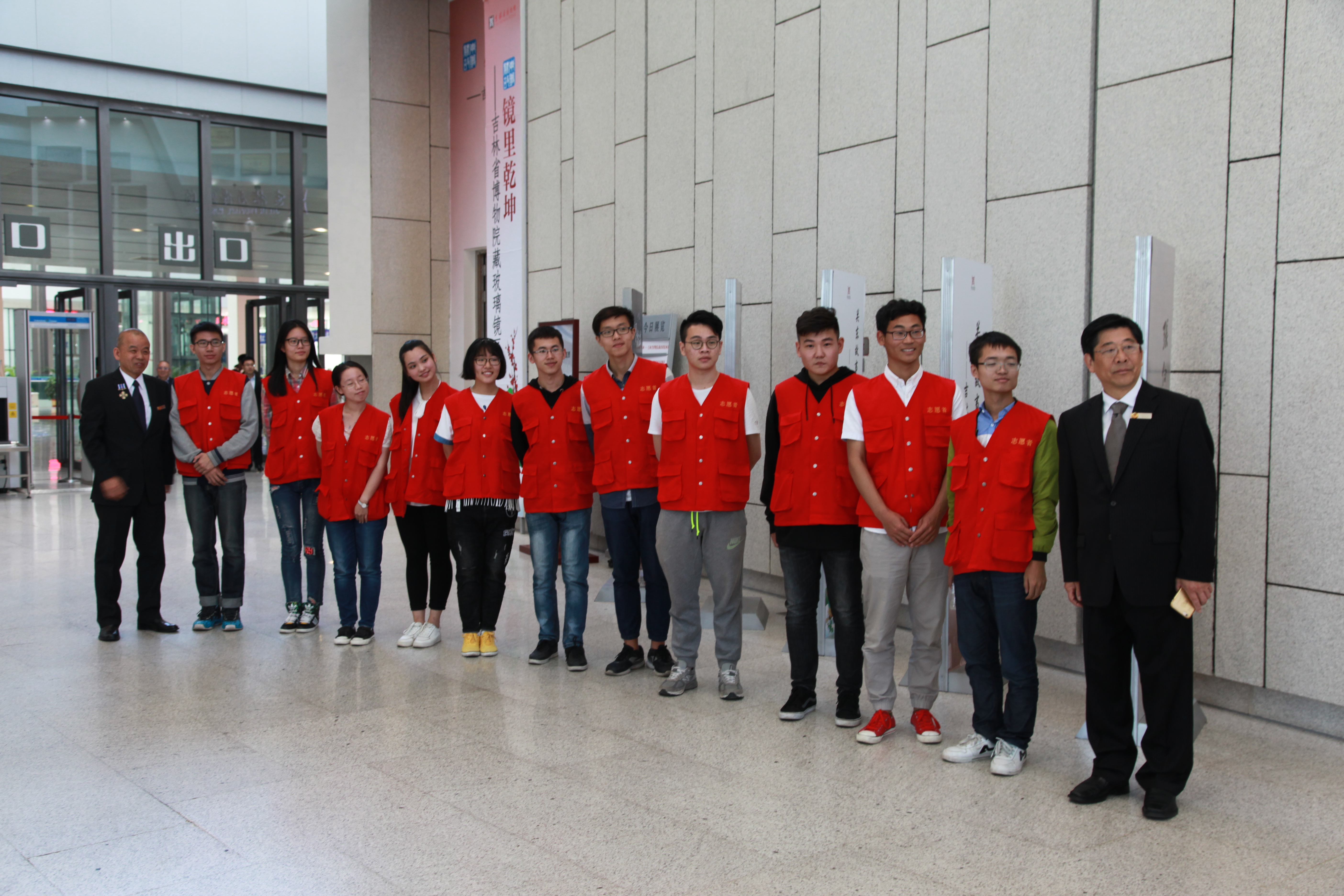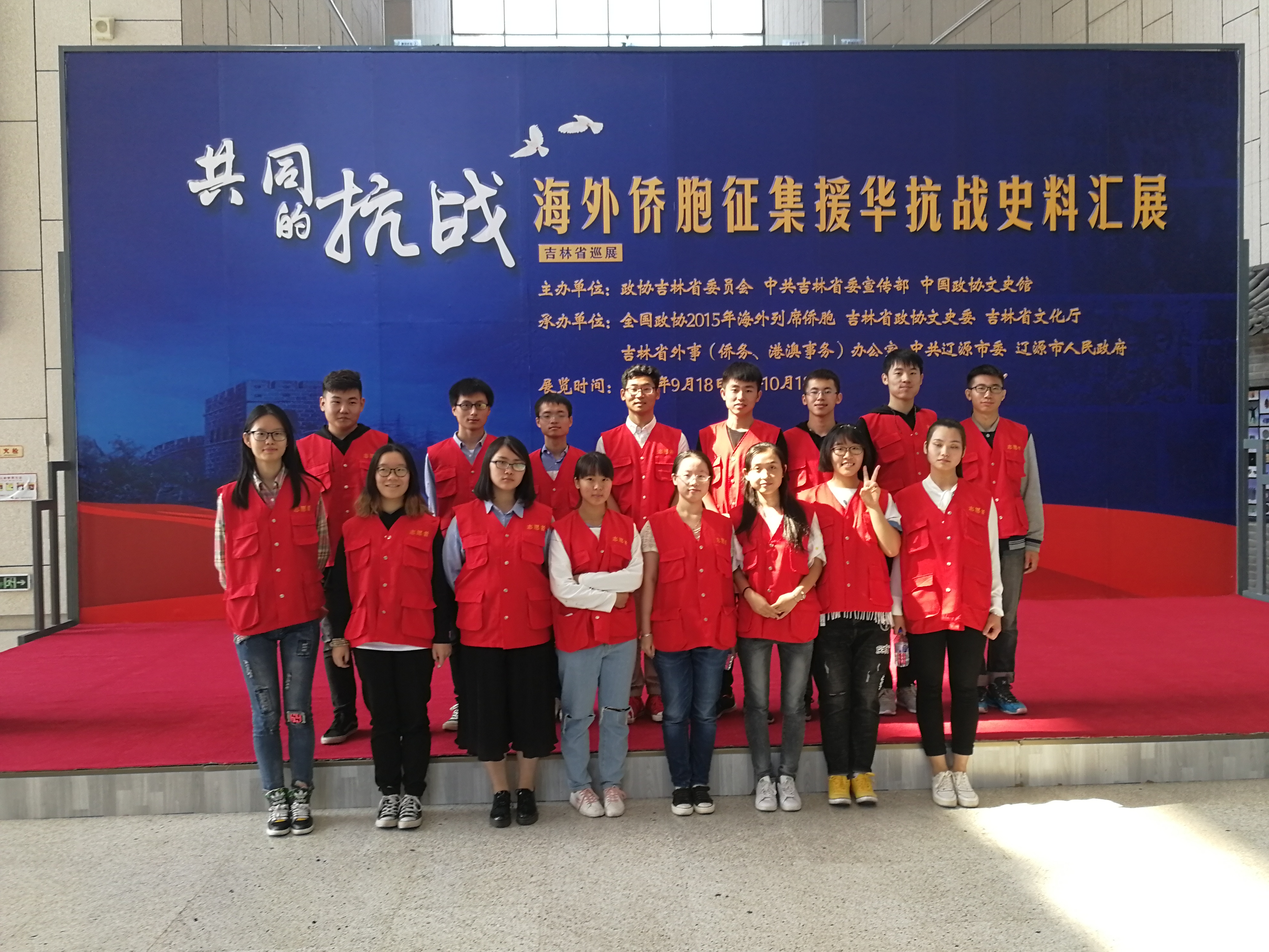 上午八点半志愿者到达吉林省博物馆,进行工作前准备,维护秩序引导嘉宾入场。九点整开幕式正式开始,阳光爱心学校志愿者空军航空大学学员、武警吉林省总队官兵以及长春东光学校师生共同奏唱国歌。开幕式结束后志愿者引导参加开幕式的各级领导、海外华侨同胞、学校师生以及武警官兵参观展览,并与老人们交流畅谈,感受那个狼烟四起的时期,共同回忆那段战火纷飞的岁月。中午十一时志愿者们成列而立,欢送各位嘉宾离开省博物馆,并与嘉宾领导合影留念。