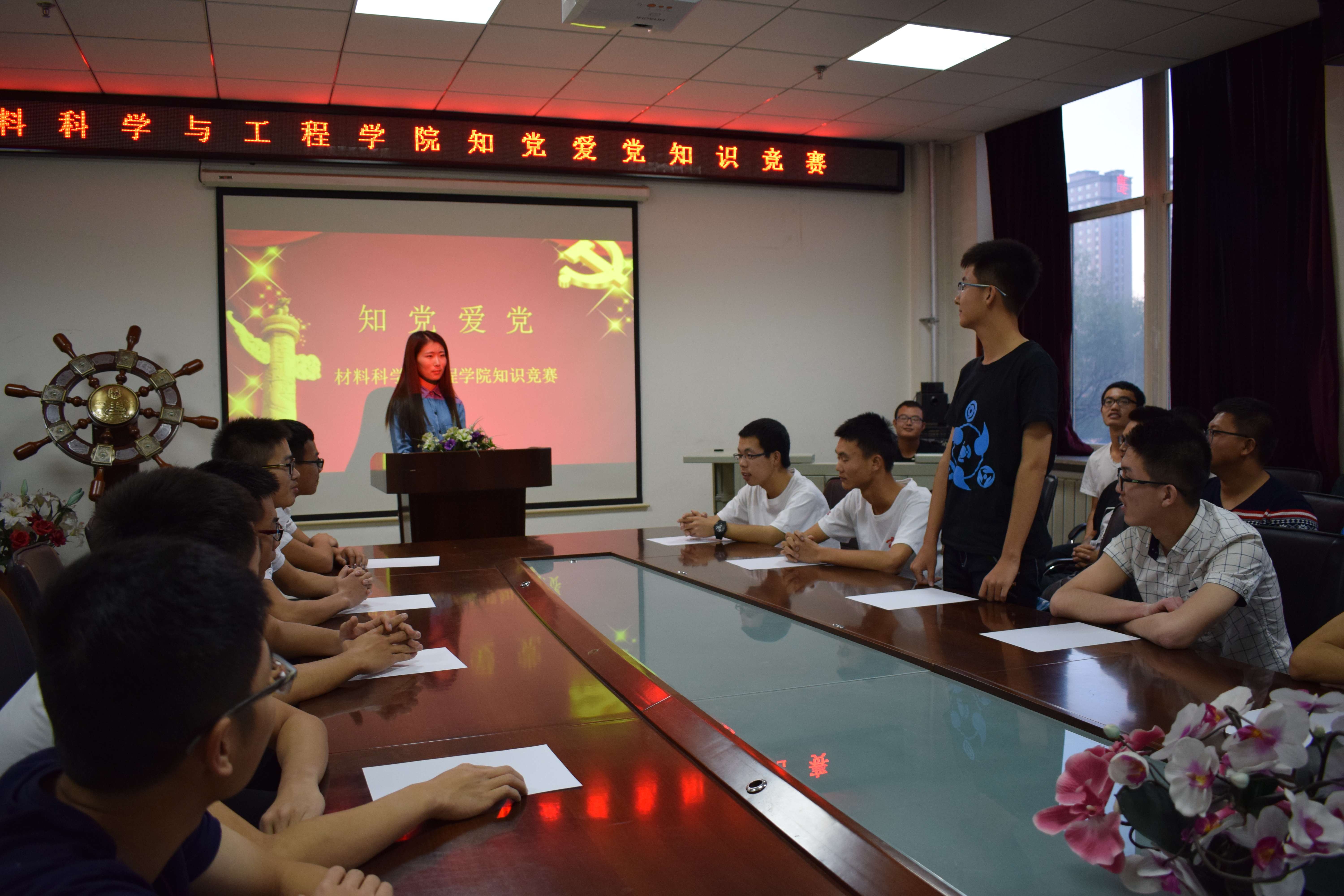 为传承革命情怀,发扬爱国精神,展现祖国风采,进一步推动女同av 校园文化的发展,加强学生的思想道德建设,提高学生的综合素质,培养广大学生的思维创新能力,展现当代大学生风华正茂的精神面貌,材料学院于6月3日开展“知党爱党,共圆美好材子梦”为主题的知识竞赛活动。经过三天初赛、复赛的筹备与比拼,于6月7日在逸夫机械材料馆410室举办了决赛并对优秀的同学进行了表彰。材料学院团委书记兼2013级辅导员张本龙出席此次活动。