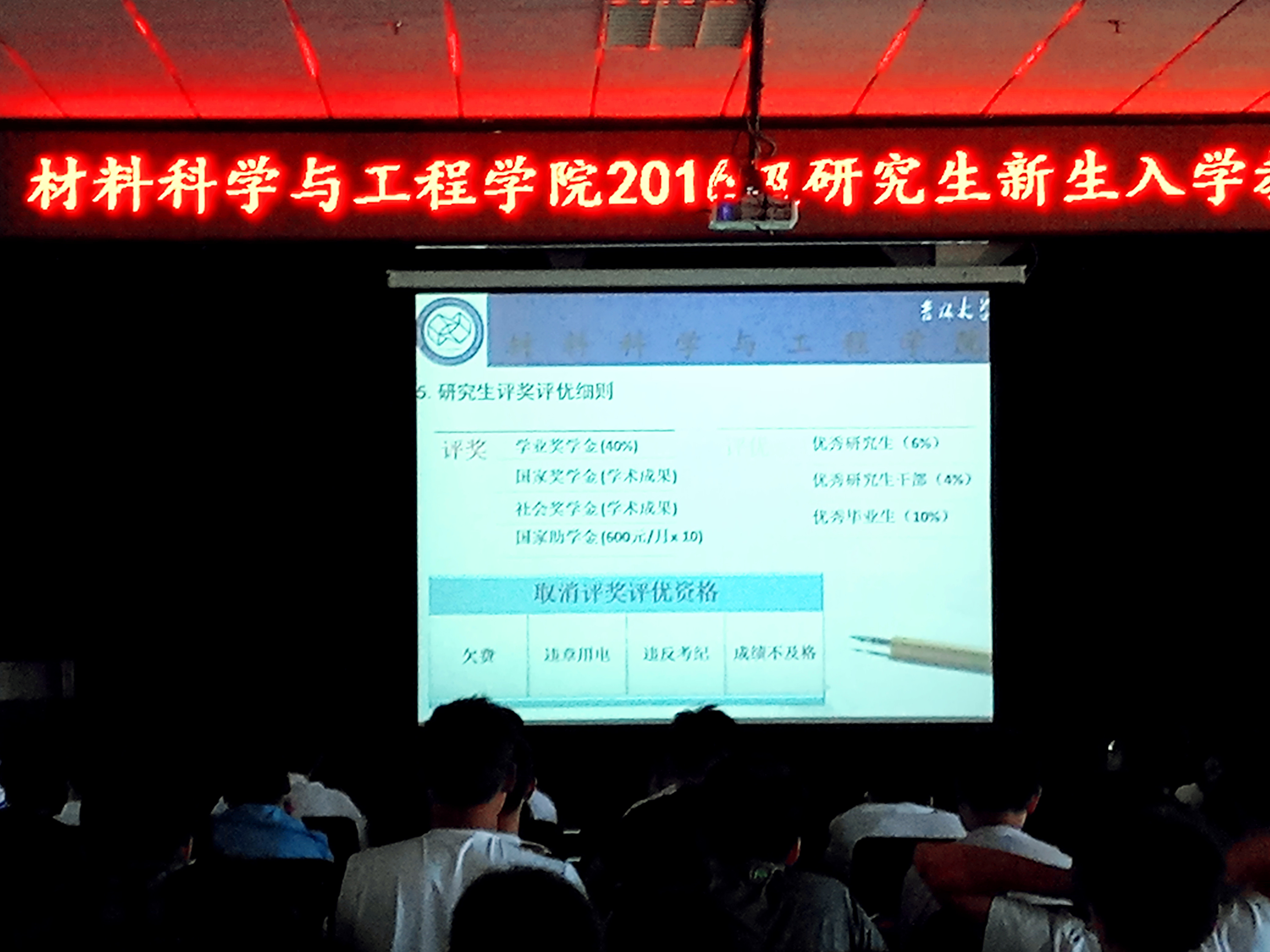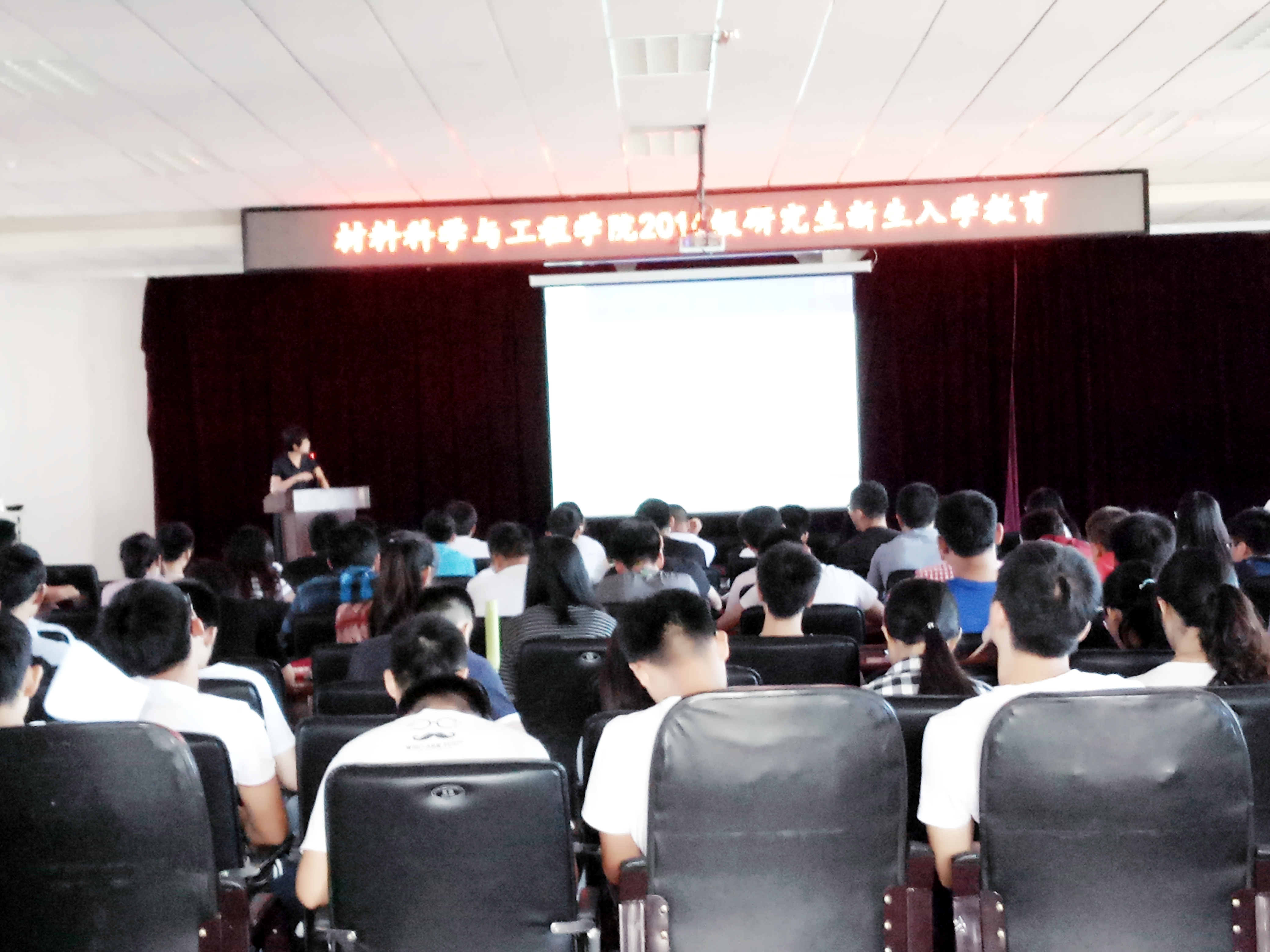 在逸夫机械材料馆八楼报告厅开展迎新入学教育系列专题讲座第三场,本场讲座由党委副书记兼纪委书记于雅琳老师主持,材料学院2016级全体博士、硕士研究生参加了本次会议。