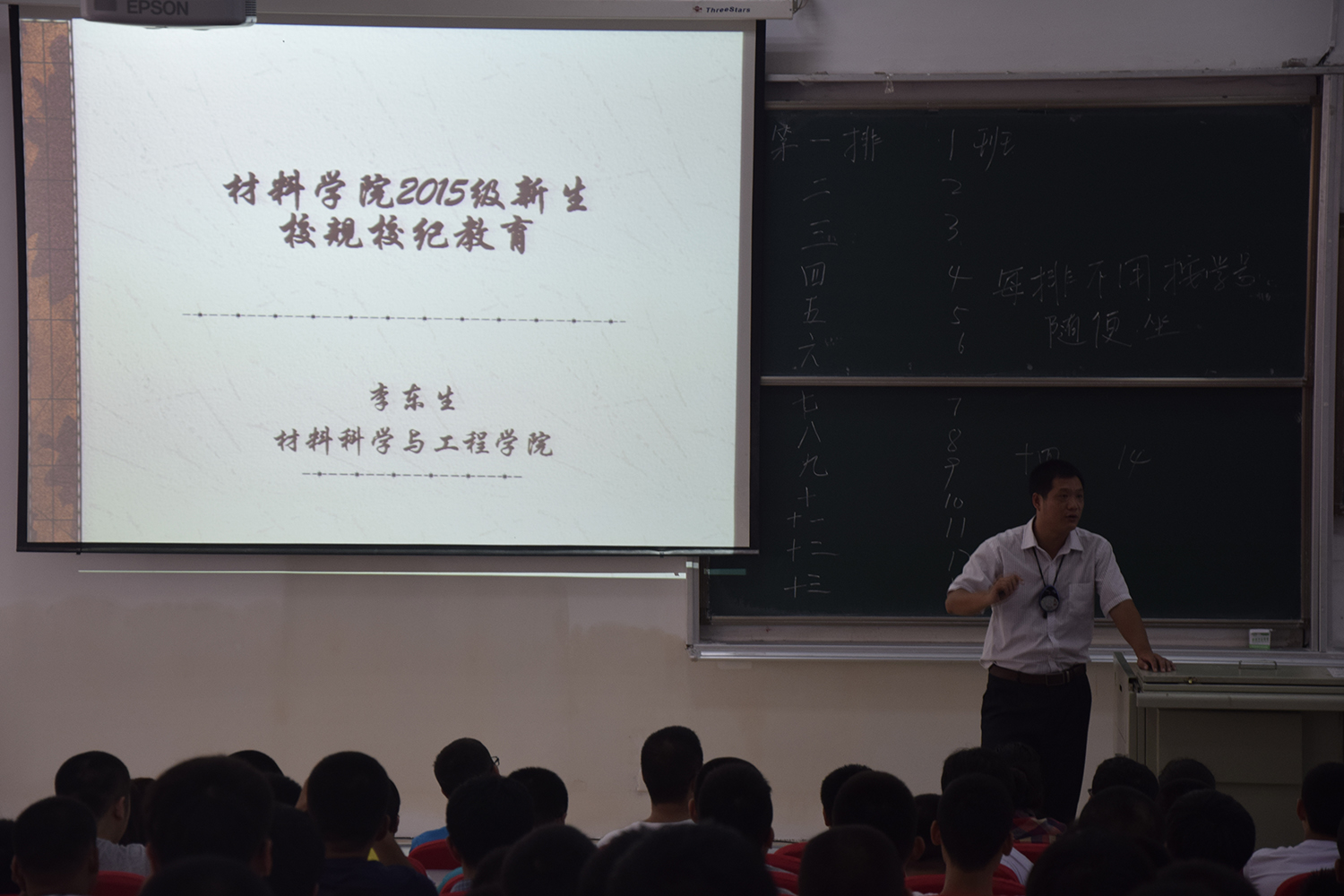 为了使新生尽快适应大学生活,调整好自身状态,9月1日,材料学院特举办关于党团教育、校规校纪、如何适应大学生活等方面问题的教育讲座活动。材料学院党委副书记兼副院长李东生担任主讲,材料学院2015级辅导员滕亚廷、材料物理专业2015级辅导员张本龙参加了本次活动。