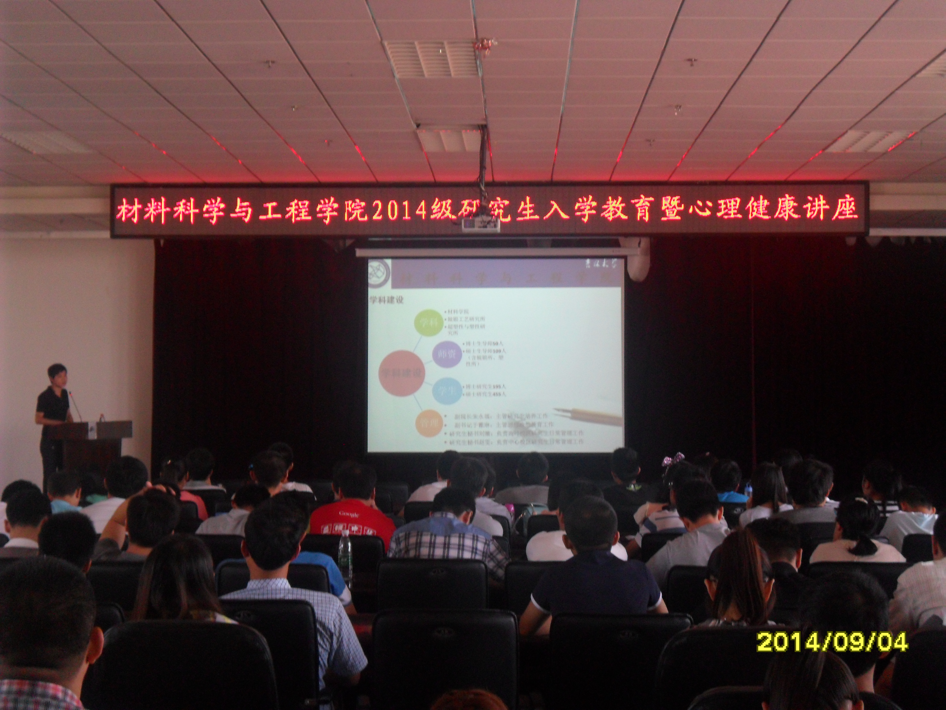 在逸夫机械材料馆举行了研究生入学教育暨心理健康专题讲座。材料学院党委副书记于雅琳老师主持了本次讲座,研究生办公室秘书刘徽老师及2014级全体硕士、博士研究生参加了本次讲座。