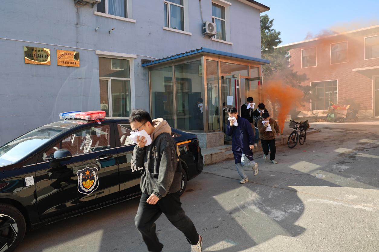 伴随着火灾警报声和现场浓烟滚滚,在学院老师和志愿者的指引下,全楼师生使用毛巾捂住口鼻、弯腰前行,按照安全出口所示的方向,从楼内稳中有序迅速疏散至楼外安全地带。东区保卫办消防科王中刚老师讲授了校园消防知识并强调了出现火情的注意事项,他详细介绍了针对不同类型火灾的扑救方法及各类消防设备的应用场合。东区保卫办刘海江老师在现场示范了如何正确使用灭火器的使用技巧,并指导现场师生们进行实操。