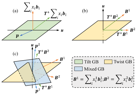 图1:晶界形成的分类情况:(a)倾转晶界,(b)特殊扭转晶界,(c)混合晶界和一般扭转晶界。