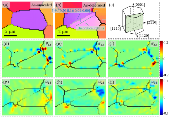 图2:通过两组位错形成小角度晶界:(a)退火样品IPF图,(b)变形样品IPF图,(c)理论预测的晶界面,(d-f)向错密度分量测定,(g-i)几何必需位错密度分量测定。