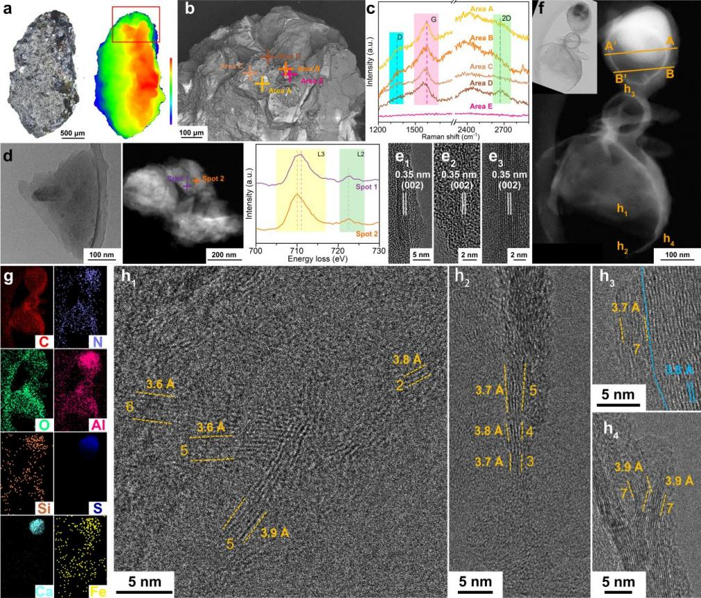 通过扫描电子显微成像、透射电子显微成像、冷冻条件下球差电镜的高角环形暗场像和高分辨像、能谱和电子能量损失谱、飞行二次质谱等多种表征技术的综合运用及测试结果的多方面严谨比对分析,探究并证实了月壤样品中检测到的石墨碳是少层石墨烯(2—7层),并提出少层石墨烯和石墨碳的形成可能源于太阳风和月球早期的火山喷发共同诱导的矿物催化进程。