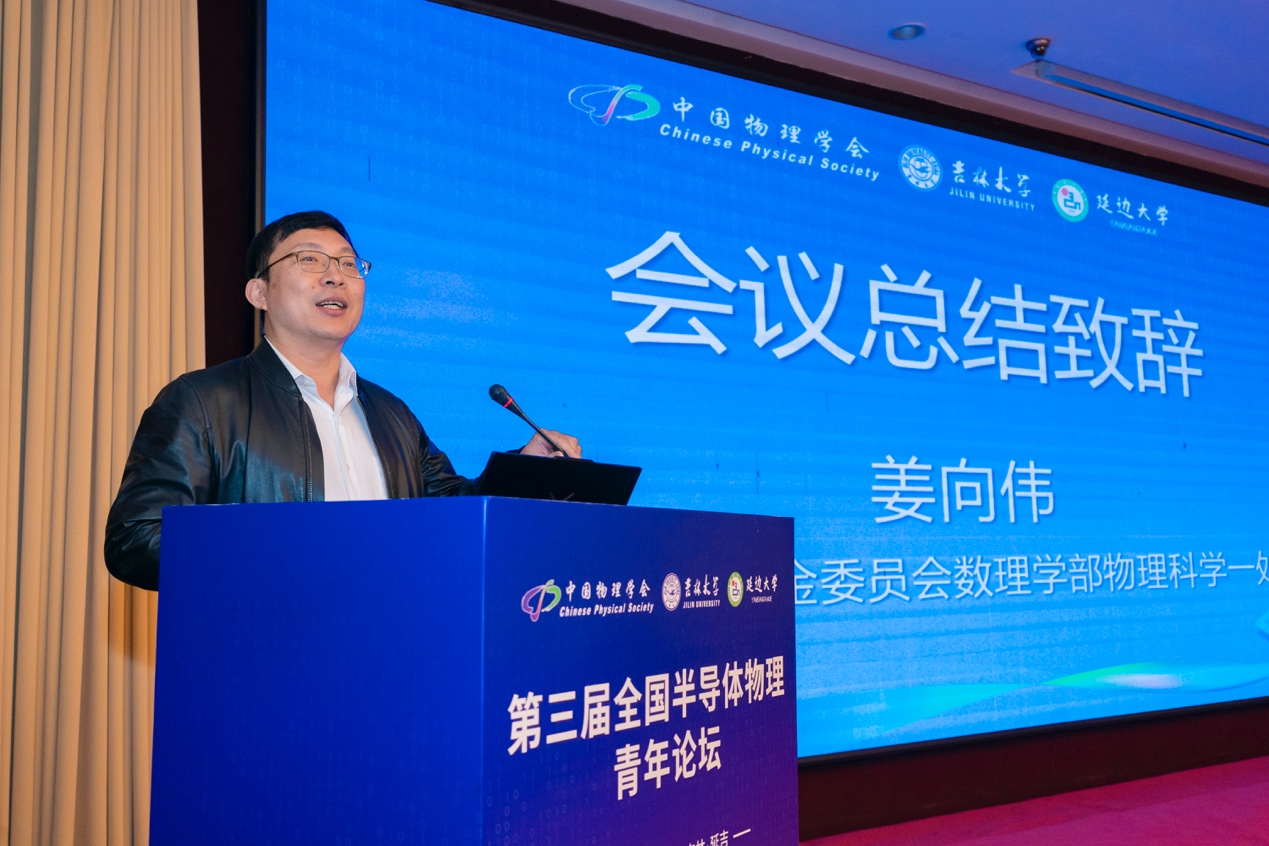电子科学与工程学院李贤斌教授主持,国家自然科学基金委员会数理学部物理科学一处姜向伟主任做了总结发言,他对本次论坛的成功举办表示最热烈的祝贺,希望各位青年学者能够继续保持对科学的热爱和追求,勇于面对挑战,勇于探索未知领域。经过论坛组委会的商议和讨论,拟定南京大学为下届全国半导体物理青年论坛的举办单位。