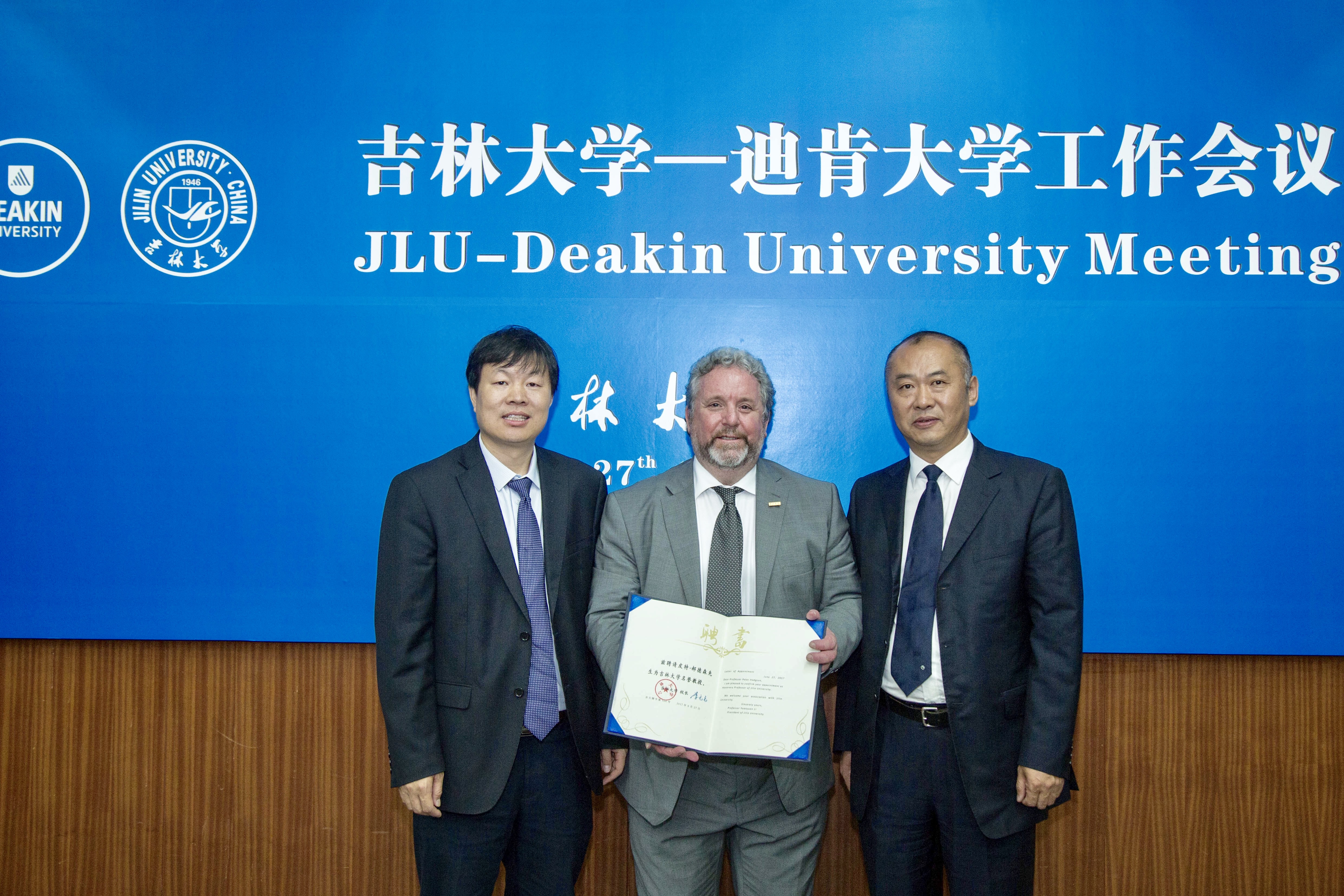 会议期间,李元元校长向迪肯大学常务副校长、澳大利亚技术科学与工程院院士、中国国家外籍“”创新人才皮特·郝德森院士颁发了女同av