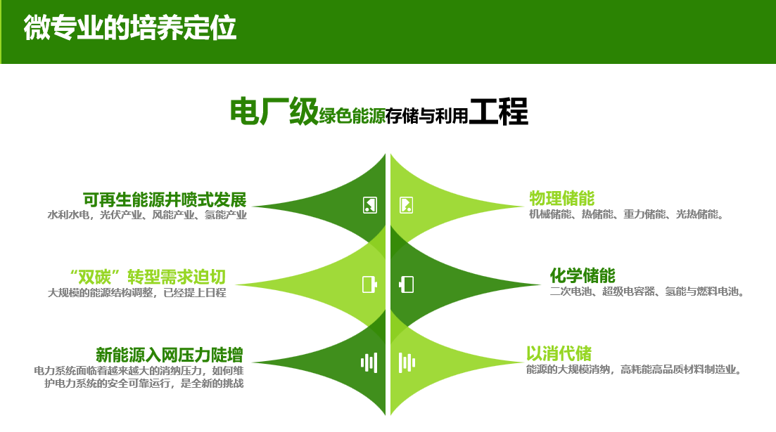 立足“双一流”学科的人才培养优势,充分考虑“储能科学与工程”领域迫切的人才需求,针对电厂级绿色能源存储与利用的产业界需求量身打造的微专业。在新型电力系统中,储能环节是新能源消纳以及电网安全的必要保障,在发电侧、电网侧、用电侧都会得到广泛的应用,且急需多学科融合型人才。预计到2060年实现碳中和目标时,我国储能人才需求规模将达百万级,人才培养缺口非常严重。