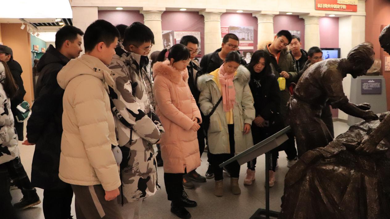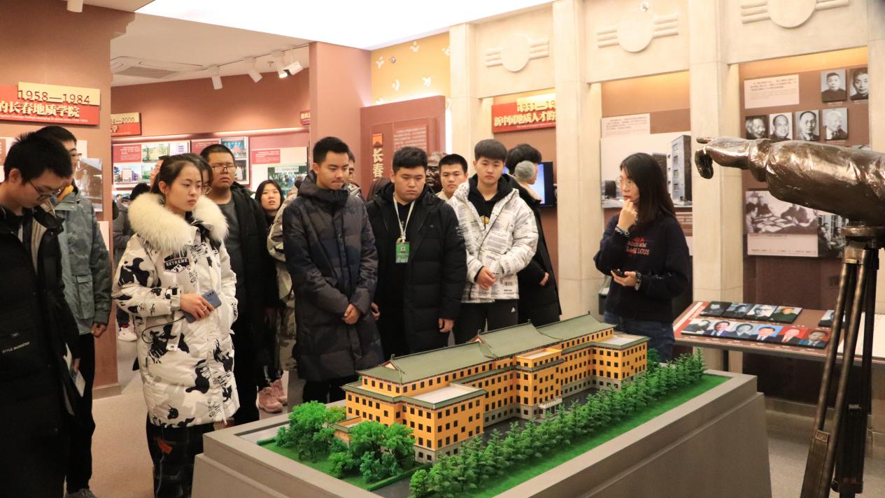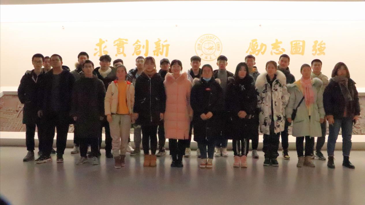 13:10开始,在展馆人员的带领下同学们依次进入位于鼎新楼东侧的校史馆。校史馆共计十余个展厅,一个个醒目耀眼的主题关键词镶嵌在红色展板上:领导关怀、光辉岁月、继往开来、星光璀璨、杏坛翘楚、芝兰玉树等。走进这一个个匠心独运的展厅中,听着讲解员述说吉大从六校合并到继往开来的发展历程,同学们都深深地被吉大的沧桑历史所震撼和感染。在“光辉岁月”展厅,一位位拓业先贤的深咖色雕像矗立在展厅最显眼的位置,坚毅的目光仿佛激励着后人不断前行,让同学们在参观中感受到,吉大今天所取得的成就来之不易。在“杏坛翘楚”展厅,领略吉大先进的科研发展成就,望着一位位从吉大走出去的院士和资深教授们的照片,同学们对吉大精神有了更深层次的了解,老教授们积极进行体育锻炼的生活习惯,更是激励同学们加强自身学习锻炼,以优秀校友为榜样,完善自身发展,立志成为学校、社会的栋梁之材。参观过程中同学们纷纷拿出手机拍照,并以此作为缅怀吉大光辉历史的留念。