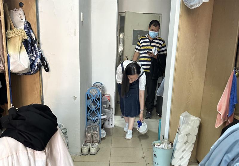 下午15:00时,学生党员志愿者在辅导员老师的带领下,来到十一公寓四楼男生寝室、十二公寓A区四楼女生寝室,对全年级寝室大清扫情况进行检查,并通过工作交流群进行检查情况的通报和沟通;同时,按照校医院老师的具体指导,开展预防性消杀工作。