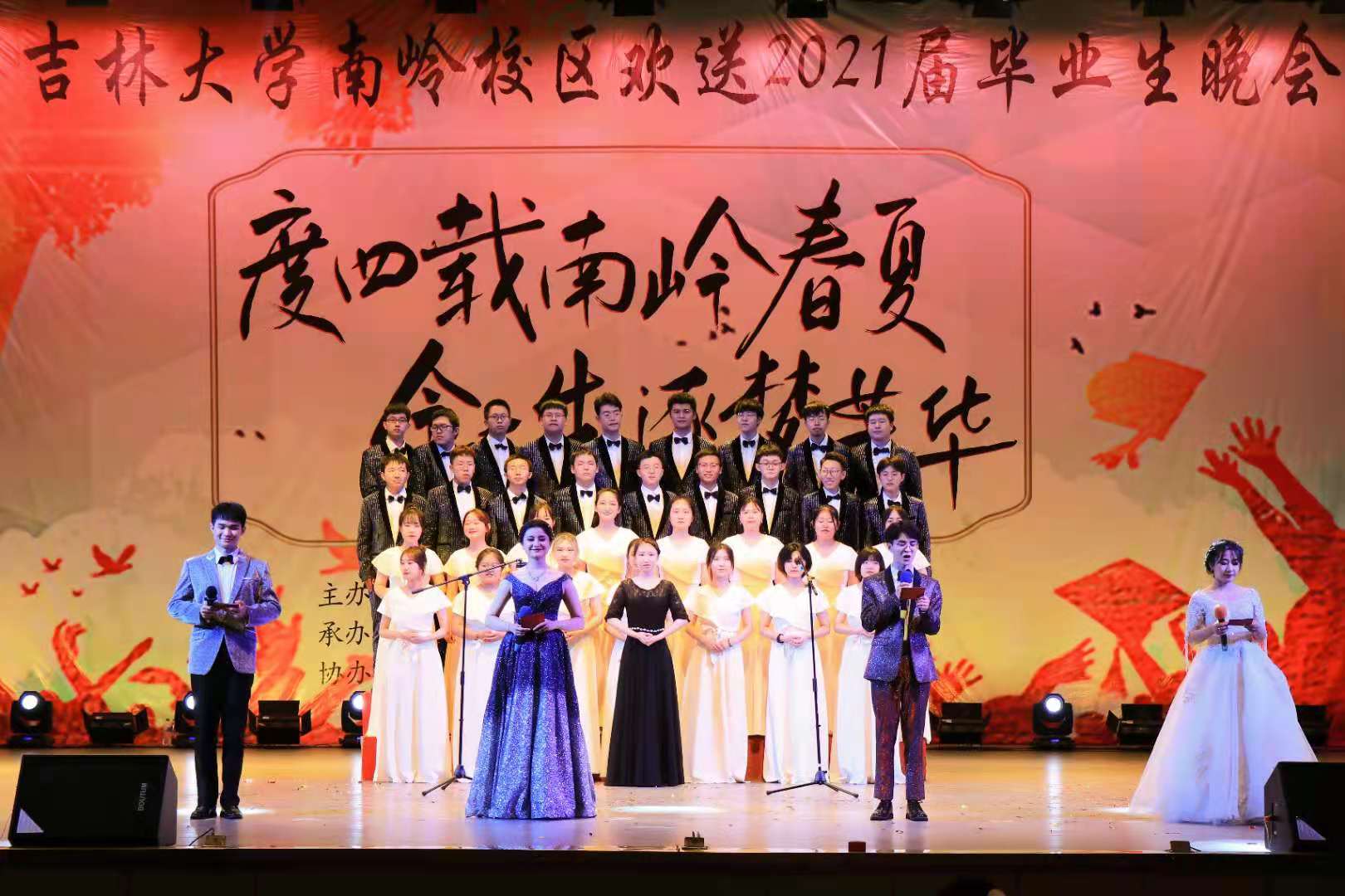 下午7时许,晚会在东区艺术团無乐队一首摇滚版《国际歌》的音浪中开场,带动了场下观众的情绪。接着是毕业生舞蹈《没有明天》,他们以灵动的舞姿跳出了青春激荡的热情与朝气,吸引了观众的眼球。声乐团带来的《我的未来式》表达了当代青年学生对未来的憧憬与向往。随后,两段街舞《like it》和《通关密码》用动感的音乐和演员们热辣的舞姿,将晚会气氛推向高潮。引人动容的器乐演奏《时空的向往》后,相声《我们这四年》以诙谐幽默的语言,带着同学们回忆起这四年的酸甜苦辣,使现场观众时而感动,时而欢笑。接踵而至的民族舞《国色》、歌曲《云与海》、《夏天的风》、《给所有知道我名字的人》无不精彩纷呈,演员们在欢快的节奏,跳跃的音符中展现出大学生的青春活力,赢得场下一阵阵喝彩。随后,在歌曲《星辰大海》的陪衬下,南岭校区各学院毕业年级辅导员们上台为毕业生们献上了最真挚的祝福。晚会临近尾声,最后一个节目是由南岭合唱团带来的合唱《梨花又开放》和《明天会更好》,晚会在合唱团高亢激昂的歌声中圆满落幕。