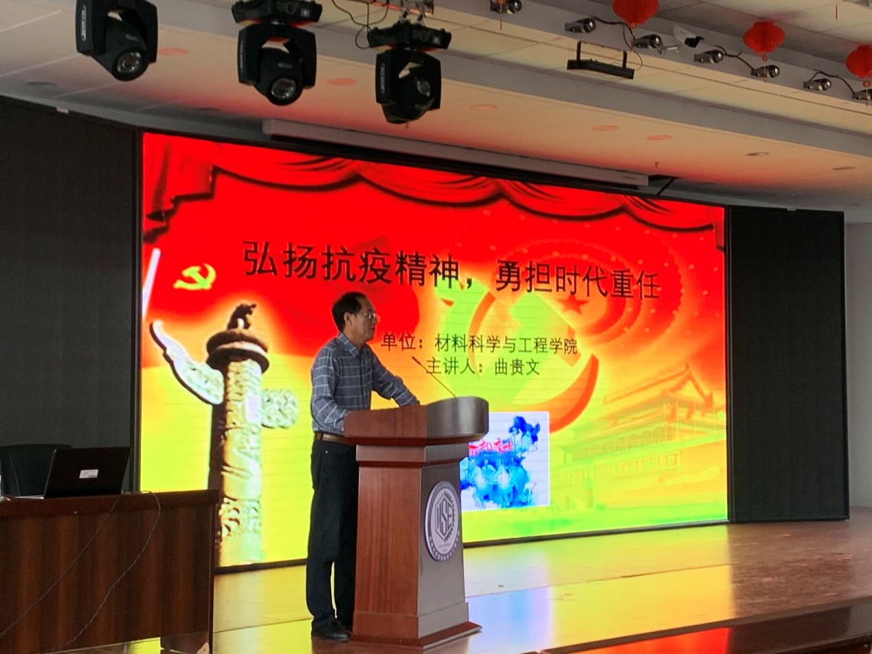 2020922900时,在材料管八楼会议室,学院党委副书记曲贵文以“弘扬抗疫精神,勇担时代重任”为题,为2019级硕士研究生党支部及2019级博士研究生党支部开展了一次党课活动。