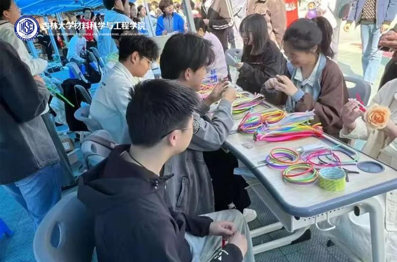 节日当天,5 家校友企业带着各自的智慧结晶惊艳亮相,其展品不仅为材料专业学子指明就业未来方向,更展现出材料科学发展的无限可能。科立宁新型母婴消毒液贴近百姓生活,展现科技对民生的关怀;捷来电移动送电车则勾勒出未来便捷出行的蓝图。大学生科技创新作品展区同样亮点十足。材料学院的志愿者们精心打造“玩转科学·实验筑材”物理小课堂,以“看得见、摸得着”的互动方式,带领大家穿越奇妙的物理世界长廊。富有传统文化韵味的 “鱼洗”,通过水波震荡展现古代智慧;充满现代科技魅力的 “等离子放电球”,以绚丽的电弧展示物理原理。高深的物理知识在简单有趣的实验操作下变得通俗易懂,让同学们感受科技创新的乐趣。在编织杏花手工活动中参与者们充分发挥奇思妙想,将金属丝弯折、盘绕,制作出形态各异的作品。有的编织成风铃状杏花串,微风拂过,叮当作响;有的盘绕出灵动小饰品,精致可爱。而文化活动中心广场前的大学生文艺表演,随着聚光灯亮起,精彩表演轮番上阵。悠扬婉转的民乐《茉莉花》,竹笛的婉转与古筝的琮琤相互交融,而活力四射的街舞《Sports Star》瞬间点燃全场,舞者腾跃的身影与飘落的花瓣共舞,杏花节的氛围推向高潮。