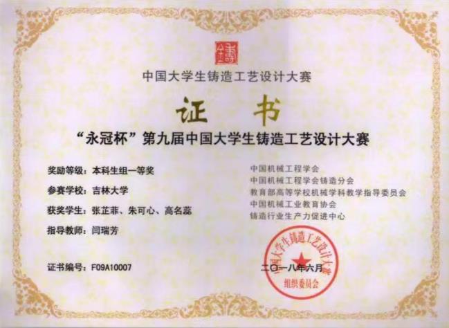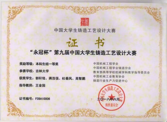 3. “永冠杯”第九届中国大学生铸造工艺设计大赛,本科生组一等奖(2项),主办单位:中国机械工程学会铸造分会、教育部高等学校机械学科教学指导委员会等,2018.06.01