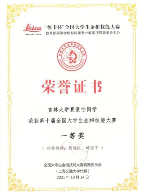 6. 第十届全国大学生金相技能大赛,一等奖,主办单位:教育部高等学校材料类专业教学指导委员会,2021.10.14