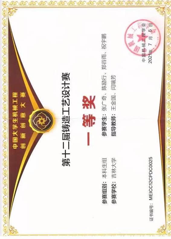 5. 第十二届铸造工艺设计赛,本科生组一等奖,中国机械工程学会,2021.07.05