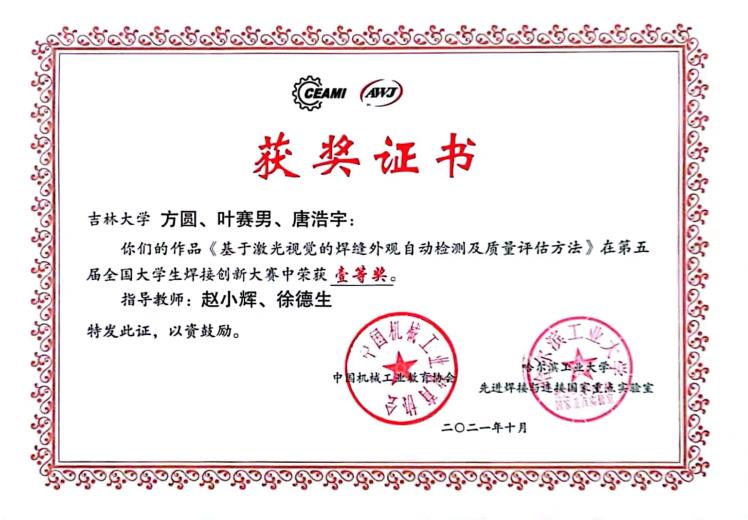 7. 第五届全国大学生焊接创新大赛,一等奖,中国机械工业教育协会,哈尔滨工业大学先进焊接与连接国家重点实验室,2021.10.01