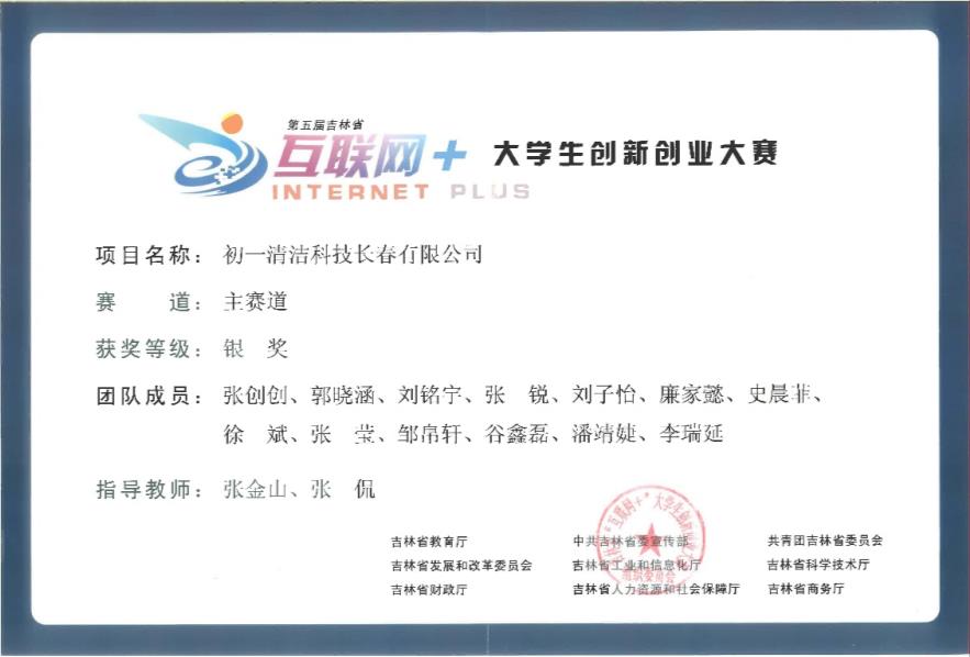 10. 第五届吉林省“互联网+”大学生创新创业大赛银奖,吉林省教育厅、中共吉林省委宣传部、共青团吉林省委员会等,2019.07.27