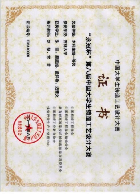 2. “永冠杯”第八届中国大学生铸造工艺设计大赛,本科生组一等奖,主办单位:中国机械工程学会铸造分会、教育部高等学校机械学科教学指导委员会等,2017.06.01