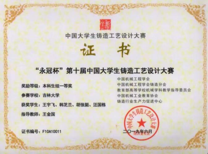 4. “永冠杯”第十届中国大学生铸造工艺设计大赛,本科生组一等奖(2项),主办单位:中国机械工程学会铸造分会、教育部高等学校机械学科教学指导委员会等,2019.06.01