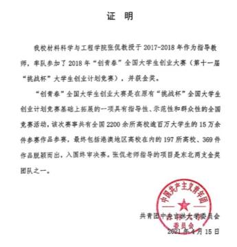 1. “创青春”全国大学生创业大赛(第十一届“挑战杯”全国大学生创业计划竞赛),金奖,共青团中央、教育部、人力资源社会保障部、中国科协、全国学联,2021.04.15