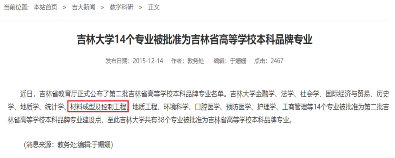 4. 第二批吉林省高等学校本科品牌专业建设点:材料成型及控制工程,吉林省教育厅,2015.12.14